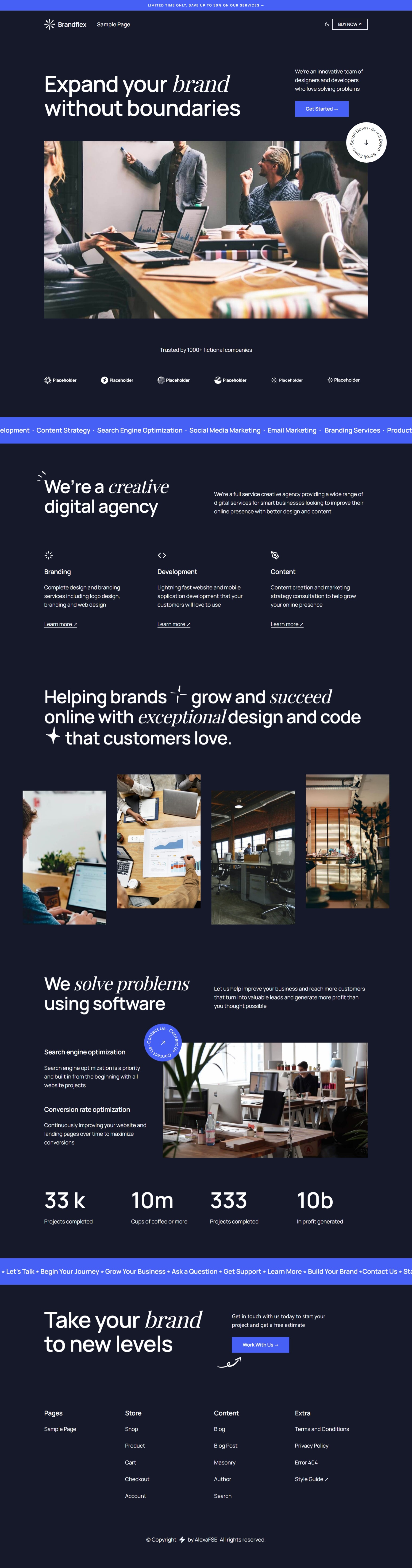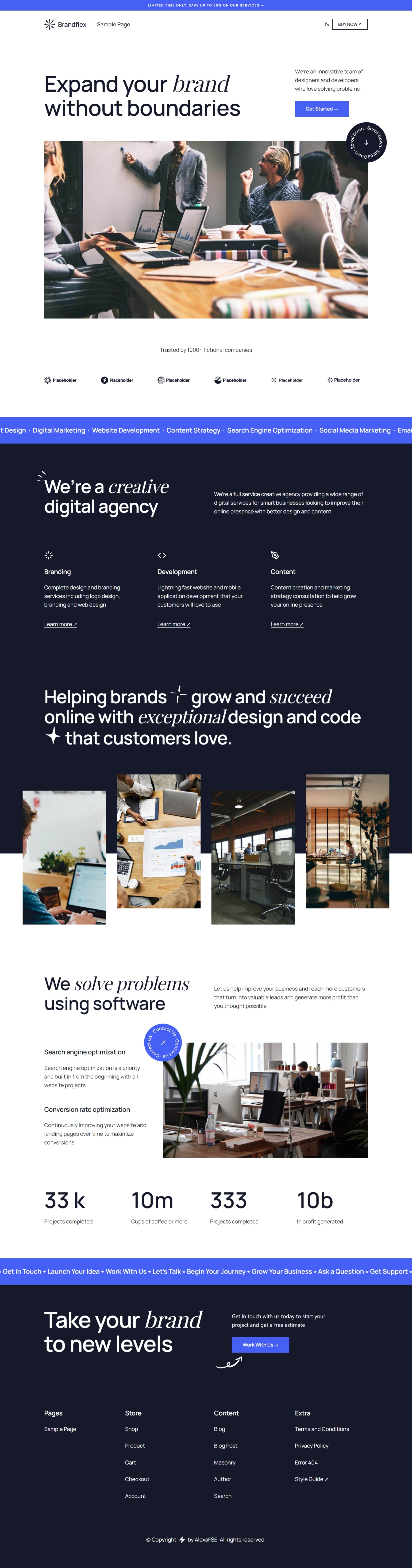 Modern full site editing enabled child theme for Flexblox. Features fully customizable animations, custom SVG illustrations, responsive positioning settings and more. Perfect for building a agency portfolio, business or startup website.