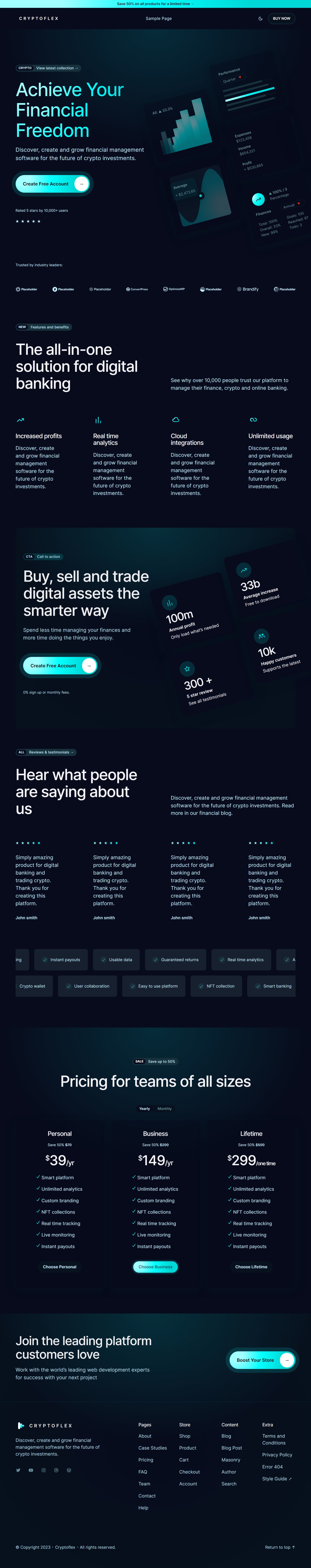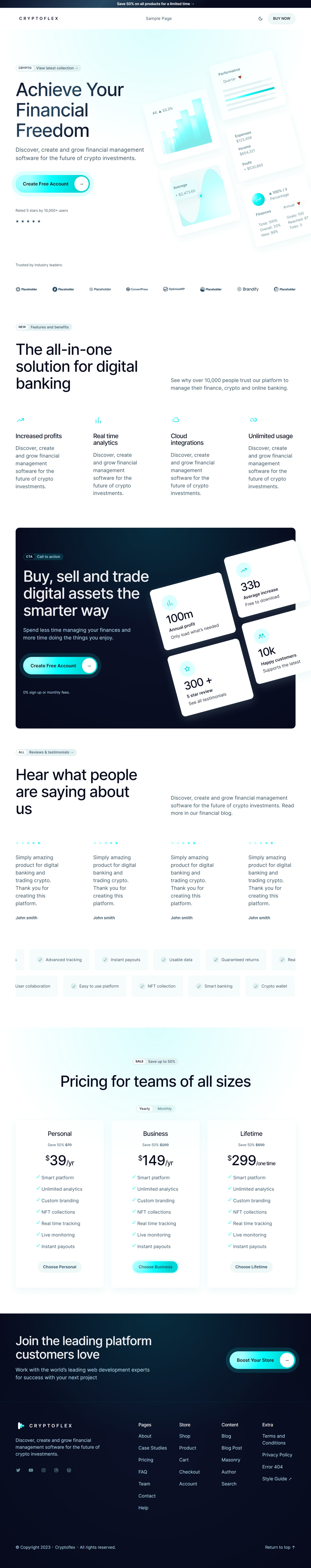 Cryptoflex (Flexblox Child Theme)is a powerful WordPress theme designed specifically for crypto, fintech, and SaaS companies. With its clean and modern design, Cryptoflex is the perfect choice for organizations looking to create a professional online presence. It features support for online banking and crypto features, making it easy to showcase your services. Its intuitive layout ensures a seamless user experience for your visitors. Check out Cryptoflex now and give your website a fresh, modern look!
